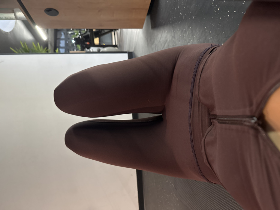 The image displays a low-angle, first-person perspective of a person's lower torso and legs, clad in dark brown athletic leggings with a visible, partially unzipped front closure