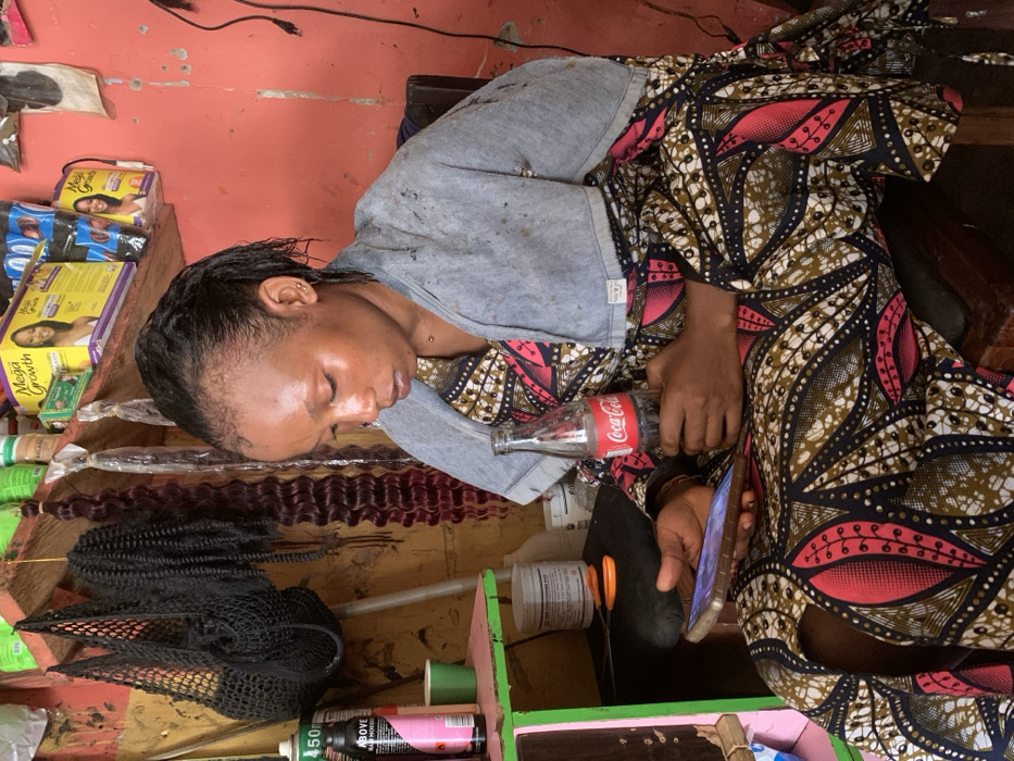 A woman sits within what appears to be a hair salon in Garaku, Nigeria, her wet, dark hair pulled back