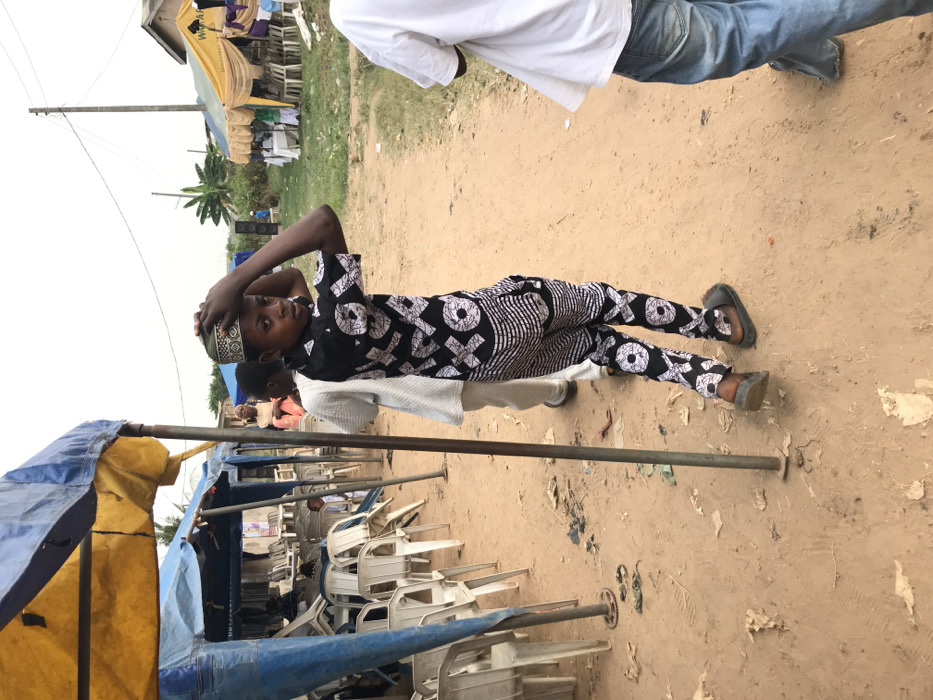 The scene depicts an outdoor gathering area in Orudu-Olokan, Nigeria, characterized by unpaved, reddish-brown dirt ground with scattered debris. A young male, approximately 10-14 years old, stands centrally, facing slightly left while looking directly at the camera. He wears a black long-sleeved shirt and matching trousers with a white geometric "XOXO" pattern, and dark slides. He is adjusting a patterned green and white cap on his head with both hands. Behind him, to his left, another individual in a light-colored garment is partially visible, facing away. To the right, the lower torso and legs of a third person wearing a white t-shirt and blue jeans are visible, also facing away. On the left, a blue and yellow striped canopy tent is erected, supported by metal poles embedded in the ground. Underneath, rows of empty white plastic chairs are arranged. Further back on the left, an adult female with a light head covering is partially visible behind the tent structures. In the background, on the right, a yellow-cream colored canopy tent with decorative fabric is visible, also containing white plastic chairs. A sign, partially reading "WOBARA," is attached to this tent. A white speaker on a stand is positioned between the two main tent areas. Beyond the tents, green foliage, including banana trees, and utility poles with overhead wires are present against a bright, overcast sky. A dark-roofed building is faintly visible in the far background on the right.