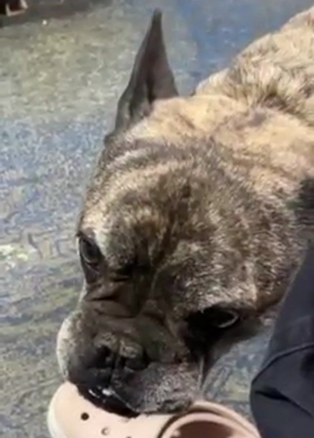 - "A dog with a short, brindle-patterned coat is gently biting on the edge of a pink Croc" by FM-Ucqa63, licensed under CC BY 4.0