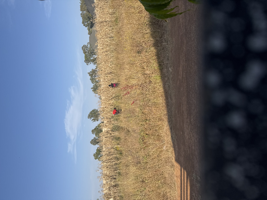 A rural landscape shows a harvested cornfield under a clear blue sky. Two figures in red shirts appear to be working or foraging within the dry corn stalks. A dirt path runs adjacent to the field, suggesting a rural or agricultural setting. Trees are scattered along the border of the field. Part of the foreground is blurred by an object, that blocks the view of the scene.