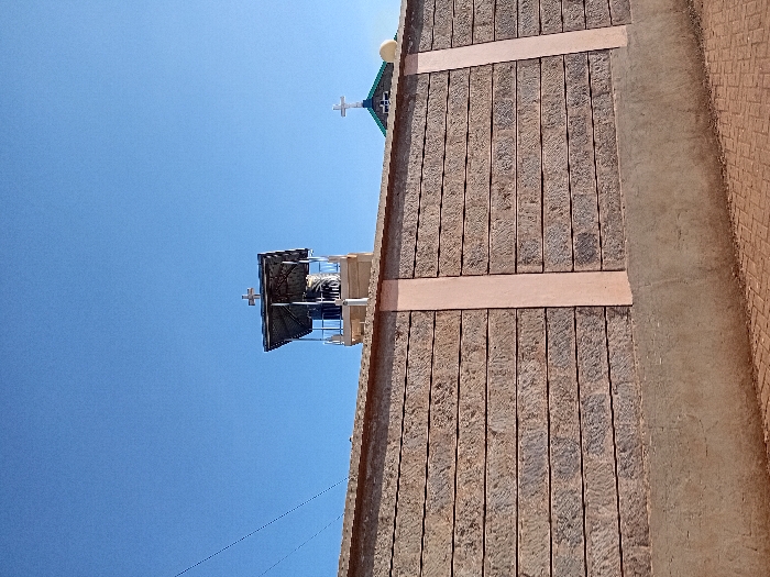 A stone building with a bell tower topped by a cross stands against a clear blue sky. The building's facade features rows of rectangular stones interspersed with horizontal bands of light-colored material. The bell tower has a metal roof and an open framework structure. A cross adorns the top of the tower and the highest point of the building's roof. Adjacent to the building is a textured surface, potentially brickwork or paving.