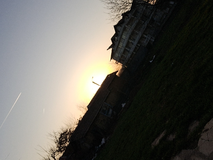 The image depicts a rural or semi-rural scene in Ruptsi, Bulgaria, at either sunrise or sunset, characterized by strong backlighting from a low-angle sun. The photograph is tilted diagonally. The upper two-thirds of the frame show a sky transitioning from a pale blue at the zenith to a bright yellow-orange near the horizon. Two linear contrails are visible: a prominent, diagonal white streak in the upper left quadrant, and a fainter, shorter horizontal streak positioned below it. The lower half of the image is dominated by a dark green, uneven grassy slope. In the extreme lower left corner, a section of cracked, light-colored concrete or pavement is visible. Two primary structures are present. To the left, a two-story building, likely residential, is silhouetted against the bright sky, revealing a dark, steeply pitched tiled roof. Bare tree branches with no foliage are visible above and to the left of this structure. To the right, a larger, multi-story building, approximately four to five stories tall, features multiple balconies with visible railings and a complex roofline with several gables. Its facade appears to be constructed of a light-colored material, possibly stone or concrete, though details are obscured by shadow. Bare tree branches are partially visible to the right of this structure. The sun, partially obscured by the structures, is positioned in the upper right portion of the midground, acting as the primary light source and creating significant silhouetting of the foreground elements. No human figures or active interactions are discernible.