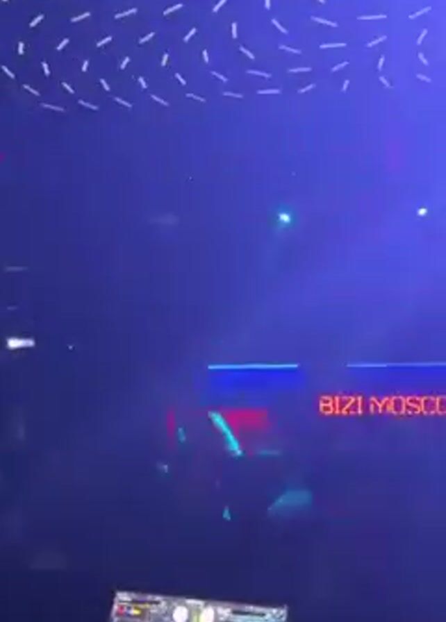 The video captures a vibrant nightclub scene. People are dancing in a dimly lit space illuminated by colorful stage lighting and flashing lights. A DJ setup is visible in the foreground, suggesting a DJ is performing. A sign that reads "BIZI MOSCOW" is also visible, indicating the club's name. The ceiling is decorated with a pattern of white dashes. The atmosphere appears lively and energetic.