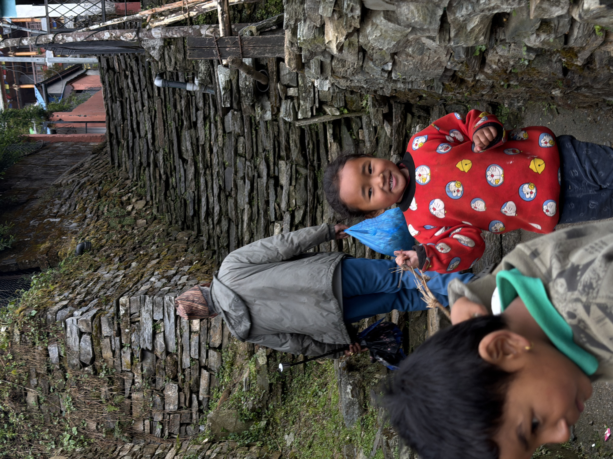 The image depicts a narrow, uphill stone staircase in the city of Ghandruk, Nepal, flanked by dry-stone walls. Three individuals are ascending these steps. In the mid-ground, an adult male is seen from behind, wearing a grey hooded jacket, blue pants, and a patterned cap. He holds a blue plastic bag in his left hand and a closed black umbrella in his right hand. In the foreground, to the right, a young girl with dark hair, approximately 5-7 years old, smiles directly at the viewer. She wears a red long-sleeved sweatshirt adorned with white and blue "Doraemon" cartoon characters and yellow bells, paired with dark pants. A small metal stud is visible in her left nostril. She holds a bundle of thin sticks in her right hand. To the left of the girl, partially cropped by the image frame, is a young boy with dark hair, also approximately 5-7 years old. He wears a green-collared shirt beneath a camouflage-patterned hooded jacket. A small gold earring is visible in his left ear. He is looking downwards and to the left. The stone steps are constructed from irregular flat grey stones, with sparse green vegetation growing between them and on the adjacent stone walls. In the upper background, beyond the adult, residential structures with orange-painted walls and traditional wooden balconies are visible, alongside a metal fence and wooden poles. A black pipe protrudes from the stone wall on the right side of the staircase.