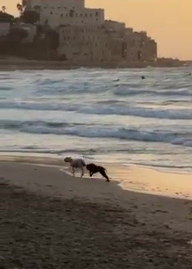 beach at sunset with a group of dogs playing. In the background, there's an old city with a tower silhouetted against the orange sky. The ocean has moderate waves. Initially, two dogs, one white and one dark, are seen running along the wet sand. Then, three more dogs appear, approaching the others. A person with dog leashes walks along the left side of the frame. The dogs continue running along the shoreline.