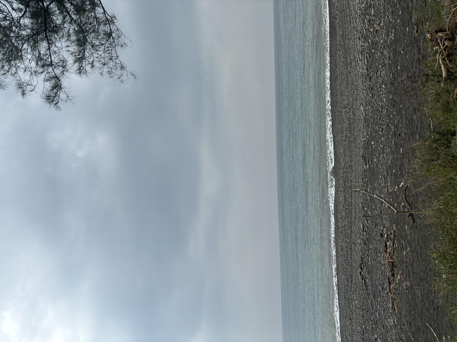 The image captures a coastal landscape under an overcast sky, located in Fangshan, Taiwan. The upper portion of the frame is filled with a uniform, light grey, cloudy sky. In the upper right quadrant, dark, needle-like foliage from a tree branch extends into view. The mid-ground features a calm body of water, likely the Pacific Ocean, exhibiting a muted blue-green color. A subtle horizon line separates the water from a hazy atmosphere. Small, white-crested waves are observed breaking gently along the shoreline. The lower half of the image presents a wide, dark grey to black beach composed of small, dark pebbles, interspersed with patches of darker sand. The immediate foreground contains sparse, dry, light brown and green coastal vegetation. Scattered on the beach and within the vegetation are several pieces of driftwood and fallen branches; one prominent, bare, Y-shaped branch stands vertically in the lower center. No human or animal subjects, nor any artificial structures, are visible. The scene suggests a natural, undeveloped coastline on an overcast day.