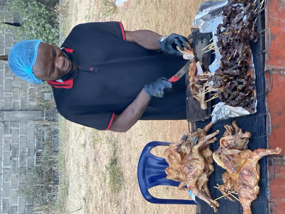 A man in a hairnet and gloves carves grilled meat with a knife. Several skewers of meat sit on the grill near him. Cooked whole chickens are placed on a blue plastic chair. A brick wall is visible in the background, as well as grass and a few pieces of trash. The scene appears to be outdoors, possibly at a barbecue.