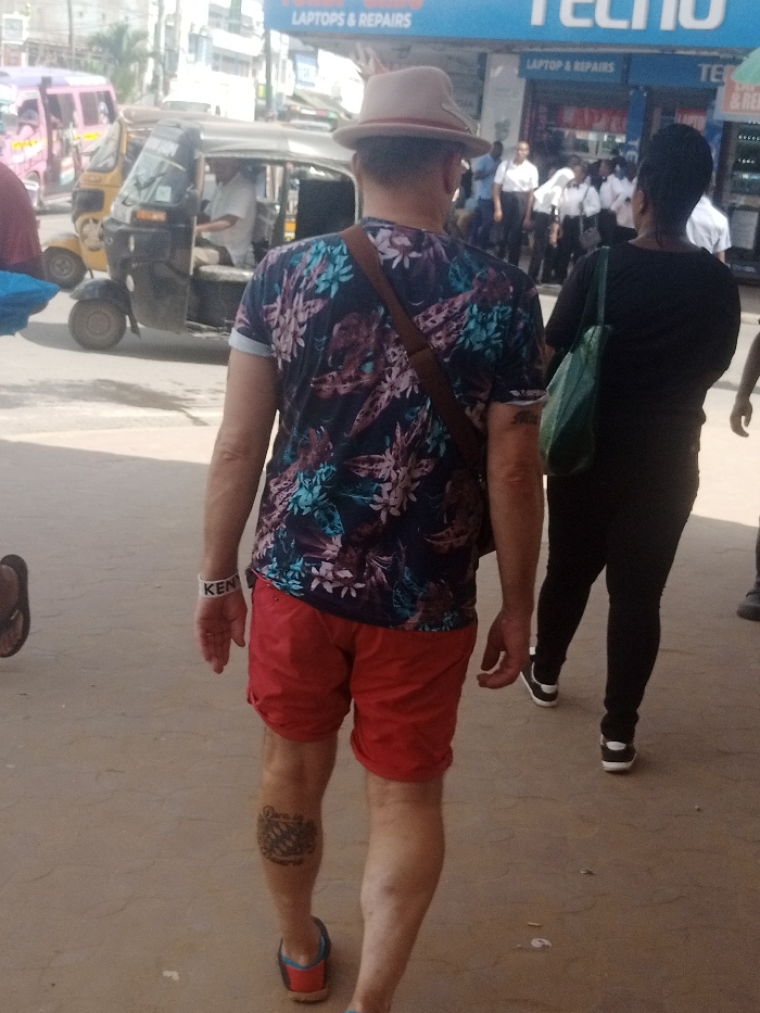A man in a fedora, floral shirt, and red shorts walks away from the camera on a city street. He wears a bracelet with "KEN" on it and has a tattoo on his right calf. Next to him, a woman in black leggings and a dark top carries a green tote bag. In the background, auto rickshaws and a crowd of people are visible, with a Tecno store sign overhead.