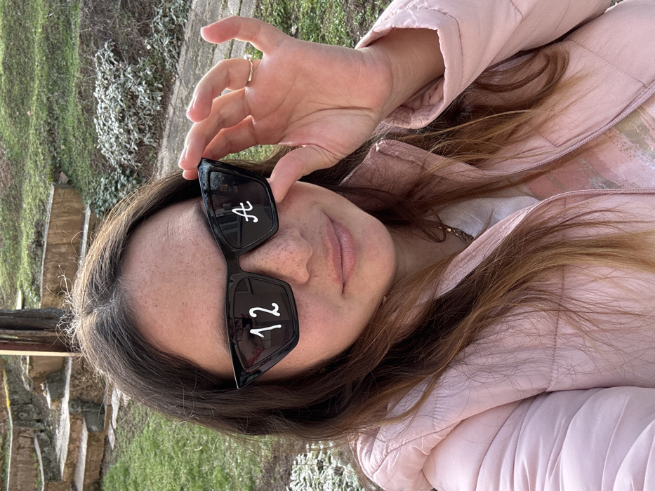 The image depicts a woman in Byala Slatina, Bulgaria, positioned outdoors. She has long, dark brown hair, a fair complexion with visible freckles across her nose and cheeks, and is wearing a light pink puffer jacket over a white garment. Her lips are slightly parted. She holds a pair of black cat-eye sunglasses up to her face with her right hand; a thin band ring is visible on her right fourth finger. The left lens of the sunglasses displays the numeral "12" in white, while the right lens features a white cursive letter "A". The background shows a sloped area with stone steps ascending to the left. Patches of green grass and low-lying, light-colored plants with a frosted appearance are visible behind the subject.