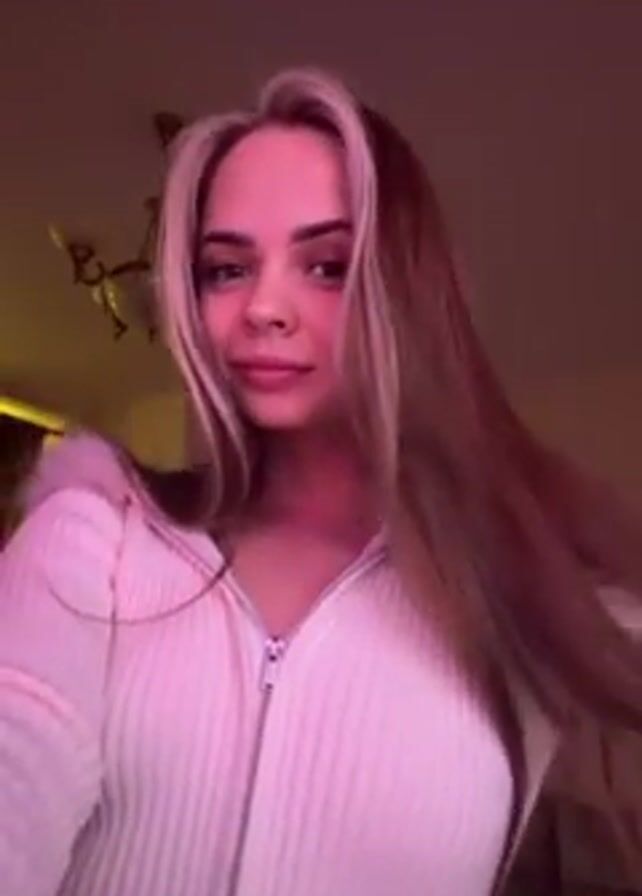 A young woman stands indoors, filmed from a low angle. She is fair-skinned with long brown hair, highlighted with blonde streaks near her face. She wears a white ribbed zipper hoodie. The lighting in the room is pink. In the background, a chandelier and a piece of furniture are visible. The woman looks into the camera and then glances to the side, holding a pose. Music is playing in the background.