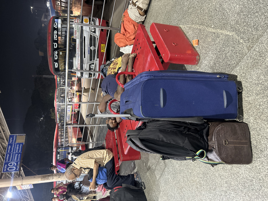 The image depicts a night scene at Platform 09 of a bus terminal, identified as Kempegowda Bus Station (Majestic) in Bengaluru, India, by the visible KSRTC buses and destination signs. The platform floor is light-colored granite or concrete. In the foreground, a large, upright navy blue wheeled suitcase is positioned next to a black backpack, which rests on a dark brown textured duffel bag. Behind these items, two red metal benches are visible. On the left bench, an older man with spectacles, wearing a light-colored plaid shirt and dark trousers, sits with a blue bag by his side, looking down at an object in his hands. Further back on the platform, two women are partially visible. On the central red bench, a man in a grey t-shirt and dark shorts is lying on his left side, asleep, with his head resting on the bench surface. A yellow shirt and other items are piled near his feet. On the right, another man lies prone on a separate red bench, covered by an orange-red hooded garment or blanket, with light-colored trousers visible. Behind a metal railing, multiple red Karnataka State Road Transport Corporation (KSRTC) buses are parked. The front bus displays "ಕ.ರಾ.ರ.ಸಾ.ನಿ" (KSRTC in Kannada) and a license plate "KA07 F1631," indicating a Bengaluru registration. The platform sign overhead clearly displays "Platform 09" and various destinations in Kannada and English, including "Hindupura," "Ananthapura," "Puttaparthi," "Gorantla," and "Mantralaya." The background is dark, suggesting a night sky or distant unlit structures, with artificial lighting illuminating the bus stand. A lone individual walks in the bus bay between vehicles.