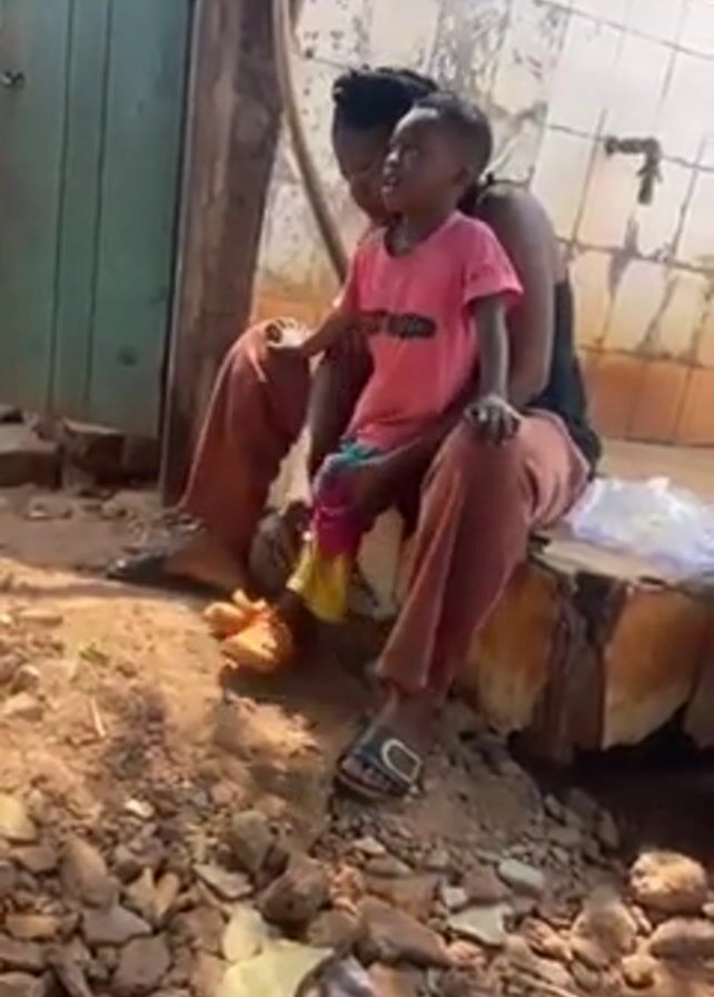 A medium shot shows a woman sitting on a cement ledge with a small child in her lap. The woman is wearing a black tank top and brown pants. The child is wearing a pink t-shirt and a colorful skirt. A man wearing a white shirt and green shorts is helping the child put on their orange sandals. The setting appears to be an outdoor area with debris on the ground and a building with cracked tile in the background.