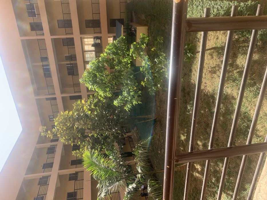 A sunlit courtyard is visible through a metal railing. A multi-story building with numerous windows and small balconies forms one side. Lush green trees and a palm tree are in the courtyard. The ground is covered in grass. The scene is bright, with a strong light source above, causing lens flare and shadows.