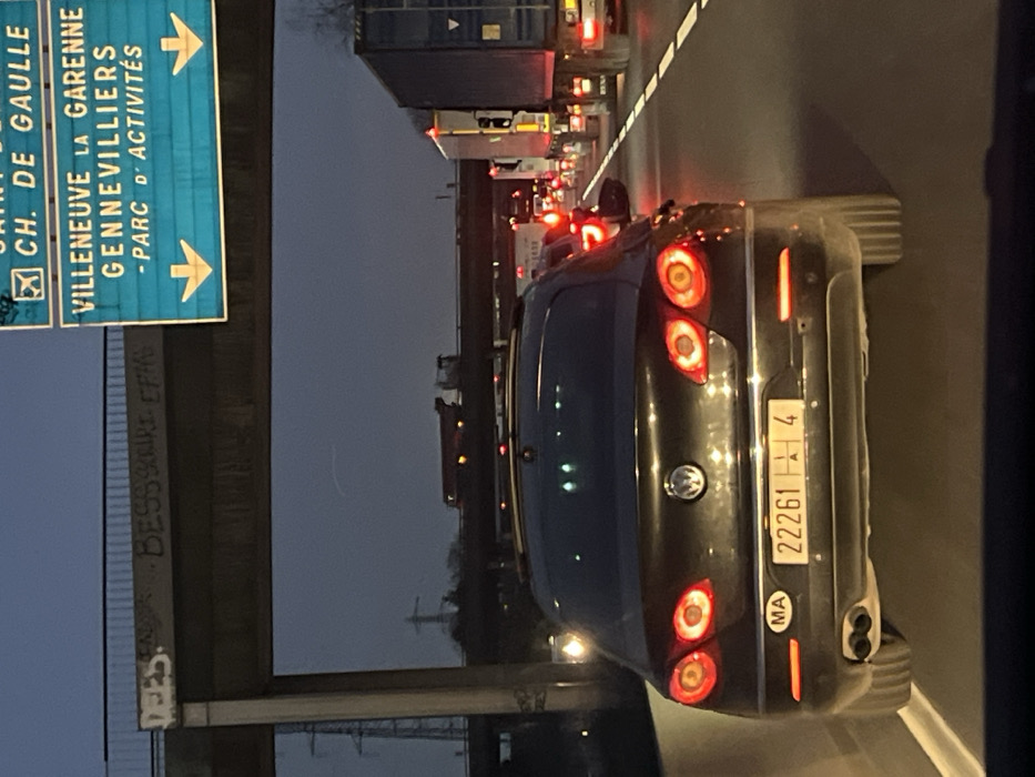 A black Volkswagen is stuck in traffic in France. The car has a Moroccan license plate that reads "22261 A 4". A blue overhead road sign indicates directions for Villeneuve La Garenne, Gennevilliers, and Parc D'activités. The sign also points to Ch. de Gaulle. Graffiti is visible on a concrete barrier near the road. The traffic ahead is heavy and congested.