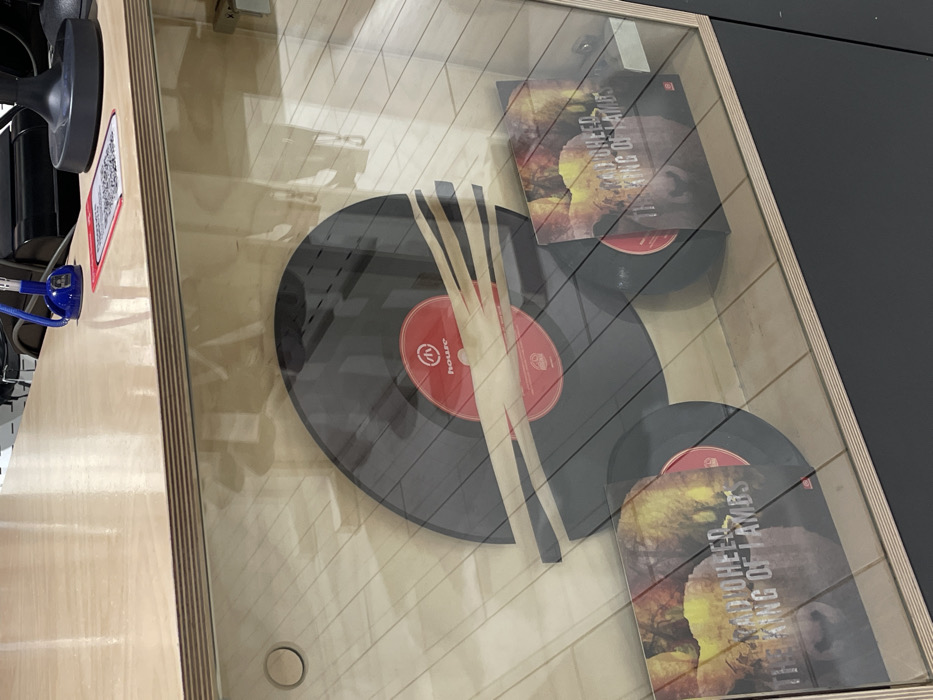 A glass-topped display case showcases a turntable and record sleeves