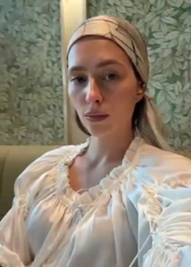 A fair-skinned woman with light brown hair, wearing a patterned headscarf and a white blouse with a gathered neckline and sleeves, sits in a chair or booth against a wall with a floral-patterned wallpaper. The woman looks directly at the camera. The camera is held at eye level and moves slightly during the short video.