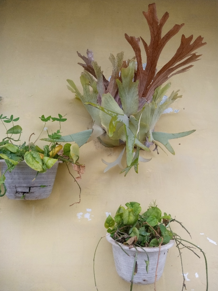 A static, vertical close-up shot depicts three distinct plant arrangements affixed to a textured, pale yellow wall in the city of Unknown, Unknown. Centrally positioned and dominating the upper frame is a large Platycerium fern, commonly known as a Staghorn fern, directly mounted to the wall. This fern exhibits multiple broad, light green sterile fronds forming a basal shield, from which numerous antler-shaped fertile fronds emerge, displaying a mix of vibrant green and dried, reddish-brown coloration, particularly towards the top. To the upper left, a weathered, light grey plastic hanging planter is mounted. This planter contains a mix of green foliage, including small plants with trefoil leaves (likely Oxalis) and other broad-leaved vines, some showing signs of desiccation. The planter itself has visible frontal damage, including a crack. A smaller, white plastic pot is mounted to the lower right, holding additional green plants and multiple thin, desiccated trailing stems. The pale yellow wall background exhibits areas of discolored paint and minor surface flaking, particularly around the mounting points of the plants. No personnel are present; no active interactions are observable within the frame.