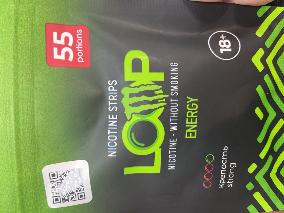 The image displays a close-up, front-facing view of a flexible product package for nicotine strips, held by a person's right thumb and index finger along its right edge. The scene is located in Rostov-on-Don, Russia. The packaging features a dark grey background with a gradient transitioning to bright green at the top and bottom edges. A white square with a black QR code is affixed to the upper left. A red rectangular label in the upper right corner indicates "55 portions" in white text. The product is identified as "NICOTINE STRIPS" in white, above a prominent green "LOOP" logo. The 'O' in "LOOP" is a hollow circle, and the 'M' is stylized with three vertical, claw-like marks. Below the main logo, text states "NICOTINE - WITHOUT SMOKING" in white, followed by "ENERGY" in green. In the lower left, a strength indicator shows three red circles and one green circle, accompanied by the Cyrillic word "крепость" and its English translation "strong". A white circular symbol containing "18+" in black is visible in the lower right, indicating an age restriction. The background behind the package is out of focus.