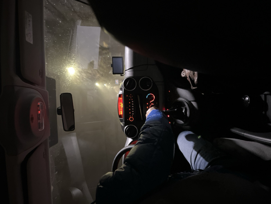 Inside a vehicle at night, a person's leg is visible against the dashboard