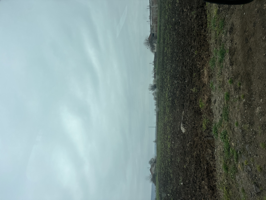 An overcast sky dominates a rural landscape in Kasnakovo, Bulgaria, viewed from a low angle, possibly from a vehicle. The sky is uniformly light grey, indicating heavy cloud cover. The foreground consists of a narrow strip of dark earth mixed with sparse green grass and weeds. Immediately beyond, a large field of dark brown, freshly tilled earth occupies the midground, displaying visible clumps and furrows of soil, with occasional patches of green vegetation. A light-colored, irregular object, likely a rock or debris, rests within the field in the mid-left portion of the image. The horizon reveals a collection of structures and sparse vegetation. On the far left, a light-colored building with a dark roof, possibly a rural residence or farm outbuilding, is partially visible against a subtle rise in the distant terrain. Towards the center-right and far right, a cluster of additional buildings with light walls and dark roofs, appearing to be farm or industrial structures, are present. Bare deciduous trees and utility poles with power lines are scattered along the horizon between and around the buildings. No individuals or active interactions are visible within the scene. A dark, curved object, possibly part of a vehicle's tire or frame, is partially visible at the bottom right edge of the frame.