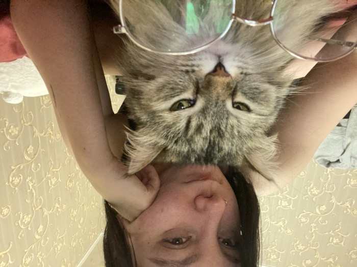 The image displays an indoor scene featuring a female individual and a domestic cat. The specific location within the city of Saratov, Russia, cannot be determined from the visual data. The upper portion of the frame is occupied by a female subject with dark hair, a fair complexion, and a small ring piercing in her right nostril. She is positioned as if reclining, resting her chin on her partially visible left hand, and directly facing the camera with a neutral gaze. Her right shoulder and upper arm, on which a faint vertical mark or tattoo is discernible, are also visible. She wears a light-colored, possibly off-shoulder, garment. A long-haired tabby cat, characterized by striped brown, grey, and black fur and narrowed greenish-yellow eyes, is centered in front of the female subject. Its expression appears subdued. A pair of eyeglasses with clear, reflective lenses exhibiting a green tint and light-colored frames rests on the cat's head or upper chest, positioned between the animal and the viewer. The background shows a wall covered in light-colored wallpaper featuring an ornate, repeating floral or scrollwork pattern. To the left, a folded grey garment is visible on an unseen surface. In the lower right, a red fabric, likely a blanket or sheet, is present, along with a white, soft object further to the right. The scene is illuminated by soft, warm lighting.