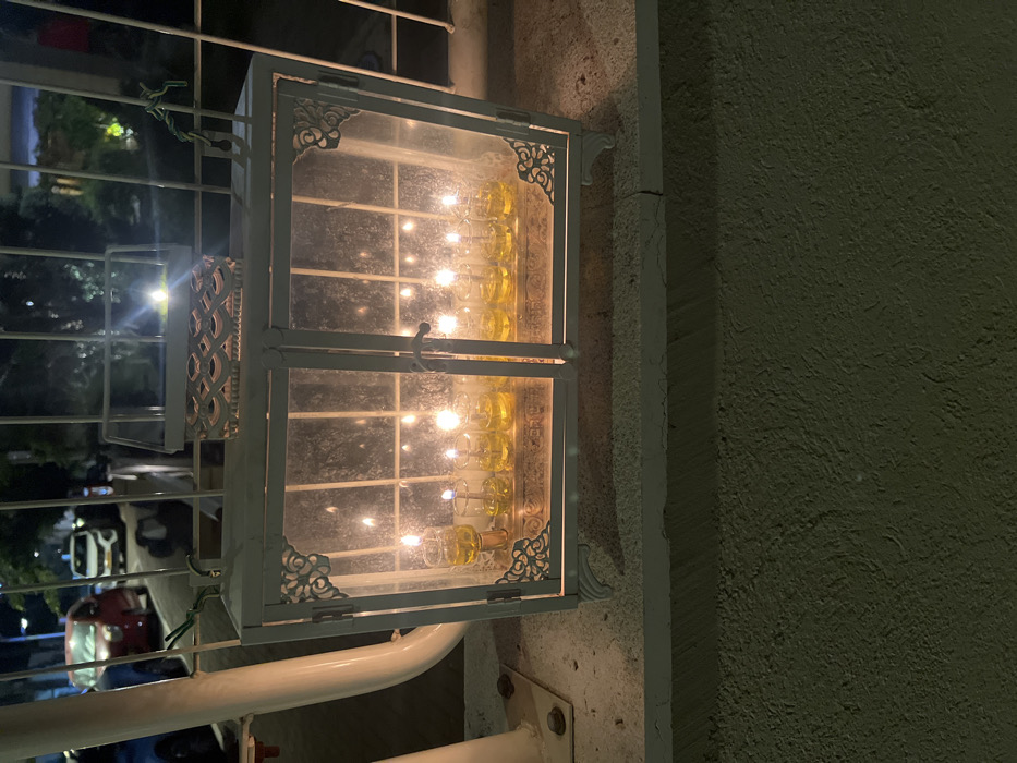 A white, ornate Hanukkah menorah lantern is illuminated from within, positioned on a concrete ledge outdoors at night in Raanana, Israel