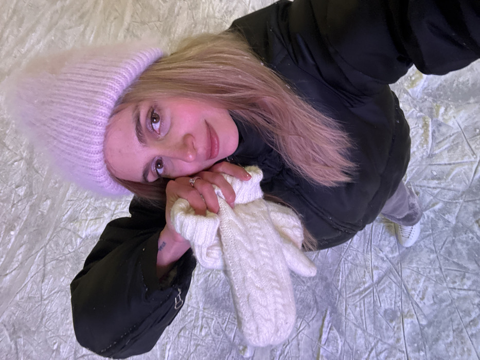 A female individual is depicted from a high-angle perspective, positioned on an ice rink in the city of Unknown, Unknown. She has blonde hair with faint pink tones, partially visible beneath a light pink, fuzzy knitted beanie. Her face is turned towards the camera with a neutral expression. She wears a black puffer jacket, light-colored pants, and a white ice skate is visible on her left foot. Her right hand holds a white cable-knit scarf or similar knitted item, positioned near her chin. A silver-toned ring is present on her left ring finger, and a small, dark tattoo is visible on the inside of her right wrist. The ice surface beneath her is illuminated and shows numerous skate blade marks.