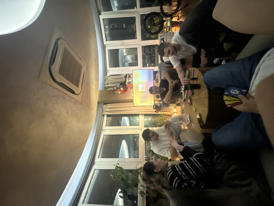 - "The scene depicts an interior gathering of six individuals within a modern apartment in Sofia, Bulgaria, characterized by large, curved windows overlooking a city at night" by FM-uXPEg1, licensed under CC BY 4.0