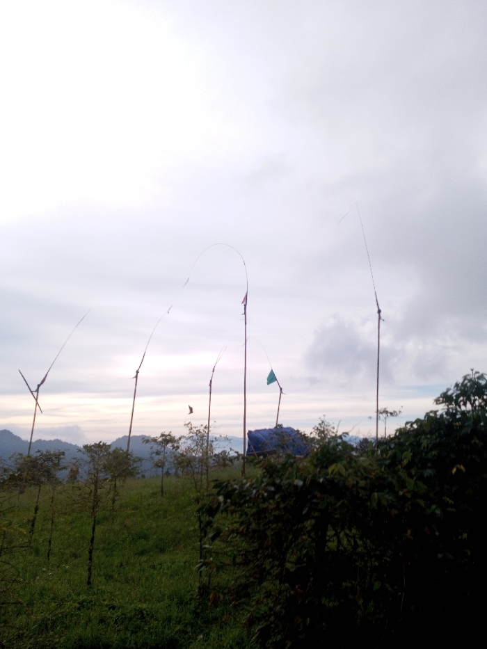 This image, taken in San Pya, Myanmar, depicts an outdoor, elevated landscape under an overcast sky. The foreground and midground consist of a green, grassy field populated by numerous small, evenly spaced trees or saplings. Denser, darker green foliage occupies the immediate right foreground. Six prominent, slender poles, consistent with bamboo, are erected vertically across the midground, with several exhibiting distinct upper curves. Small, indistinct flags or streamers are attached to some poles, including a visible green flag on a pole in the mid-right. A single, dark bird is captured in flight in the mid-left quadrant. A rudimentary structure, partially obscured by vegetation and covered with a blue tarp, is visible in the mid-right. A hazy, distant mountain range forms the horizon line beneath a light grey, cloudy sky. No human subjects or direct interactions are visible.
