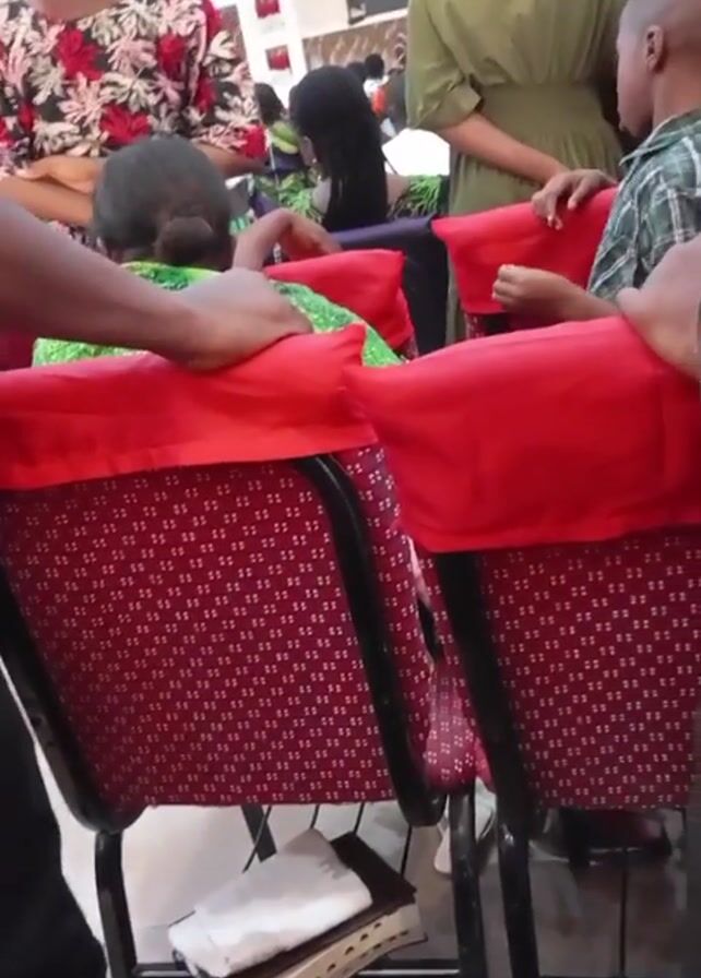 The camera captures a low-angle, medium shot of a gathering of people in what appears to be a church or a similar venue with rows of chairs. The chairs are upholstered in a red and patterned fabric, with some covered in red fabric. Several people are seated, while others are standing and mingling. The people are dressed in various outfits, including a woman in a floral patterned dress and a face mask, a woman in an olive green dress with her back to the camera, and a young boy in a plaid shirt who is holding onto the back of a chair. A man in a suit is seen partially in the foreground on the left and right sides of the frame. In the lower left corner, a stack of books and papers is placed on the floor. The background includes other individuals and interior elements, suggesting a public space. The lighting appears to be a mix of natural and artificial, contributing to a somewhat bright and airy atmosphere.