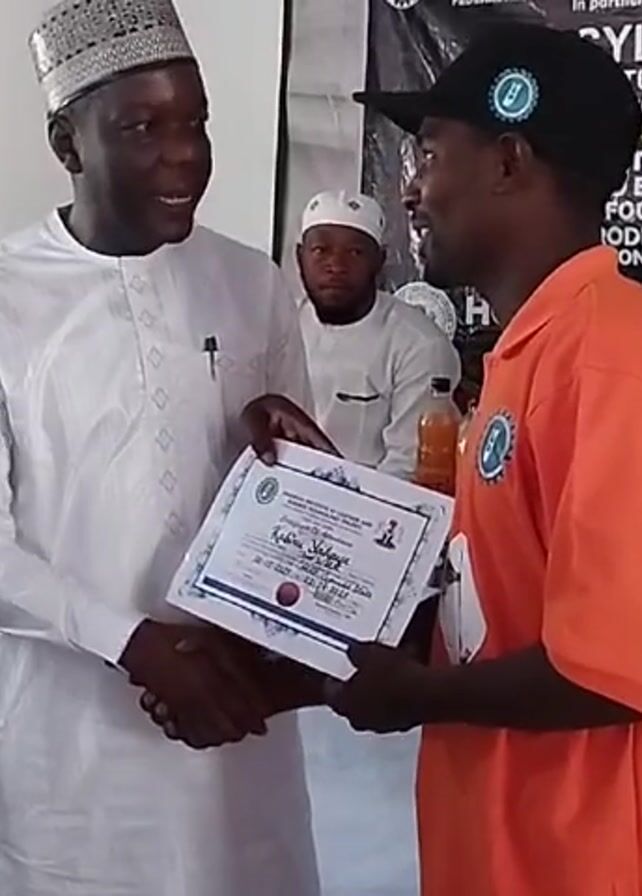 man in a white outfit and a patterned cap shaking hands with a man in an orange shirt and a black baseball cap. The man in the white outfit is holding a framed certificate. The man in the orange shirt is receiving the certificate. Several other people are in the background, some seated and some standing. There is a table with water bottles and other items on it. Behind the table is a banner with text on it, including the words "GRADUATION CEREMONY FOR WOMEN EMPOWERMENT." The event appears to be taking place indoors in a well-lit room.