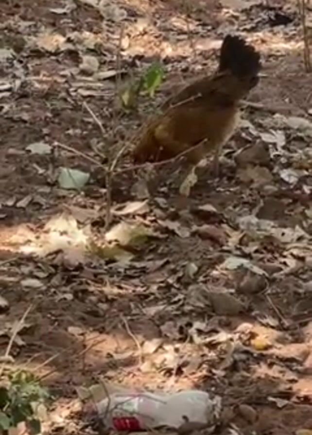 brown chicken pecking in a dirt lot strewn with fallen leaves. There is a white and red plastic bottle in the foreground. Voices and music can be heard in the background.