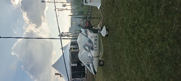 - "A white and green 5Y-KWX gyrocopter is stationary on dark green grass, its cockpit covered by a clear protective material" by FM-auFgD2, licensed under CC BY 4.0