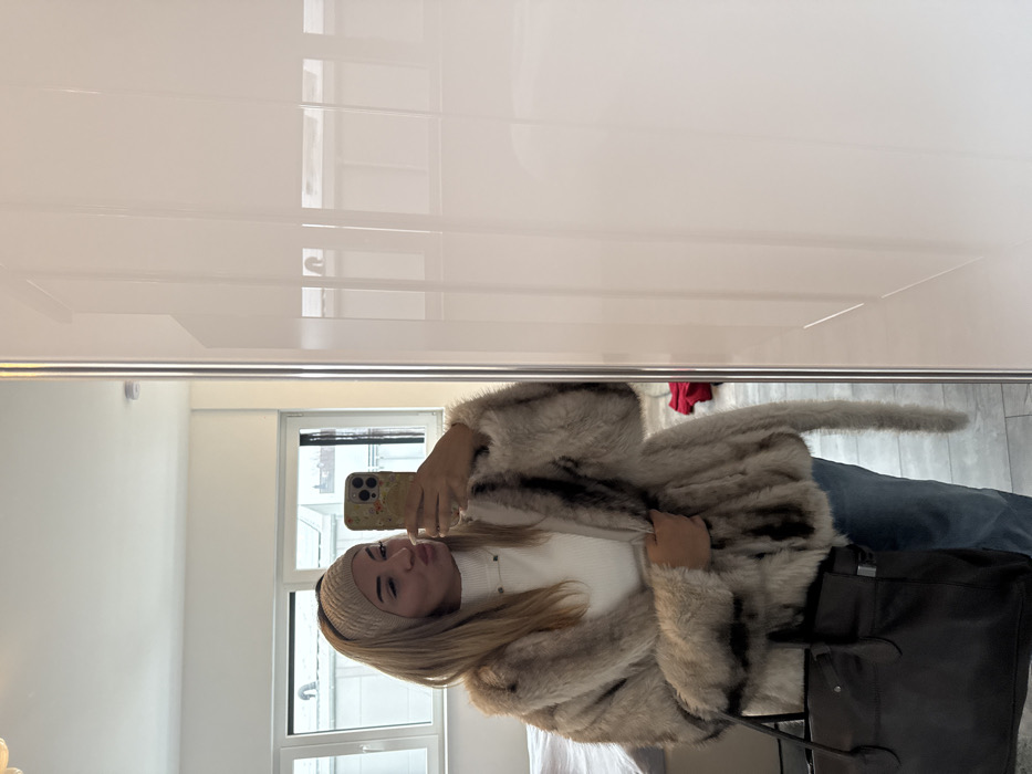 The image depicts a young adult female captured in a mirror selfie within an indoor setting. The room features light-colored walls and large windows, through which exterior rooftops or buildings are partially visible under a bright sky. The specific location in Lich, Germany, cannot be confirmed solely by visual evidence in the image. The subject is a female with light-colored hair and a tanned complexion. She is wearing a beige knitted headband, a white ribbed turtleneck top, a beige and black striped faux fur coat, and blue jeans. A delicate silver-colored necklace with a small pendant is visible at her throat. She holds a smartphone with a floral-patterned case in her raised right hand, angled to photograph her reflection. Her lips are pursed in a "kissing" or "pouting" expression. A large, dark brown or black leather tote bag with silver-colored hardware is held in her left hand, resting against her side. To the right, reflected on the floor behind her, a folded red garment or fabric is partially visible. The mirror capturing the reflection appears to be part of a large, white, high-gloss wardrobe or cabinet system.