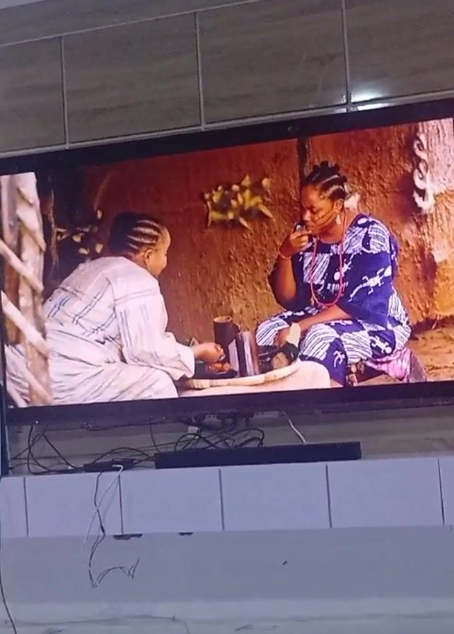TV displaying a scene from what appears to be a movie or television show. Two women are seated on the ground inside what looks like a mud house or dwelling. The woman on the right is wearing a blue and white patterned outfit and has her hair braided. The woman on the left is wearing a striped white outfit. They are both facing each other. The woman on the left is holding a black object. Subtitles on the screen show that they are having a conversation, and the woman on the left says, "What things? Strange things." The camera is angled slightly upwards toward the TV. The TV is mounted on a white tiled surface and there are various wires visible. The wall behind the TV is tiled with brown squares. The floor has a marble-like pattern.