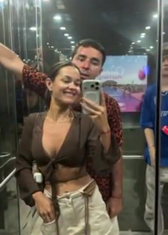 The video captures a selfie taken by a woman in an elevator. She is wearing a brown, tied crop top and a white, short skirt with decorative ties. The man behind her is wearing a red and black animal-print shirt. Another person, a young man, stands in the back of the elevator. The elevator has mirrored walls, reflecting the people and displaying advertisements on the back wall. The woman smiles at the camera as she takes the selfie. The man behind her stands close to her.