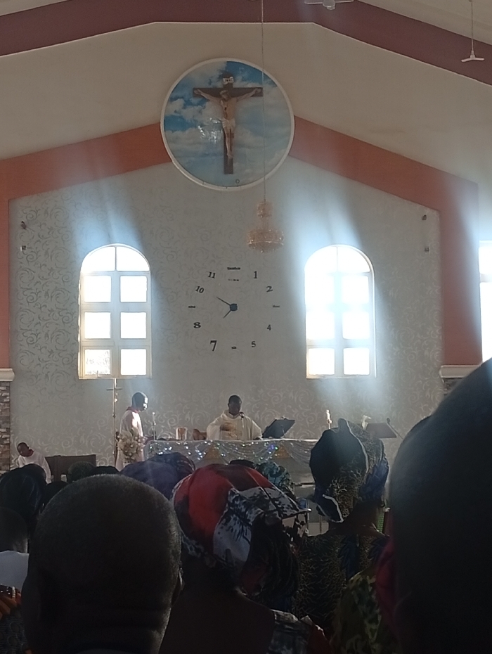 The image displays the interior of a church in Jos, Nigeria, observed from the perspective of the congregation. In the foreground, the backs and heads of numerous individuals, many wearing patterned fabrics and head coverings, are visible, indicating they are facing forward. In the midground, a priest, clad in a white liturgical vestment, stands behind a draped altar, addressing the gathering via a microphone. To the priest's left, another individual in a light-colored vestment stands holding a bouquet of flowers or a similar ceremonial object. Bright sunlight enters the space through two prominent arched windows on the rear wall, creating visible light rays. Between these windows, a large clock face, without an outer casing, is painted or mounted directly on the patterned wall, showing numbers 1 through 12 with hands pointing approximately to 10:45. Centered higher on the wall, above the clock, is a large circular display depicting a crucifix with Jesus on the cross against a blue sky with clouds, and "INRI" written above the figure. The church features light-colored walls with a repeating scroll pattern and a high, sloped ceiling accented with dark brown trim. A decorative chandelier hangs from the ceiling, partially obscured by light.