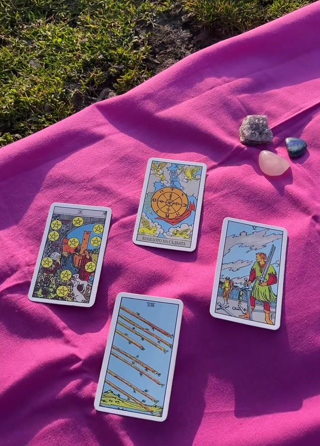 tarot card spread on a bright pink cloth. The cloth is spread out on grass in an outdoor setting. The four cards visible are the Ten of Pentacles, the Wheel of Fortune, the Eight of Wands, and the Two of Swords. A small pile of crystals or rocks is near the top right corner of the cloth.
