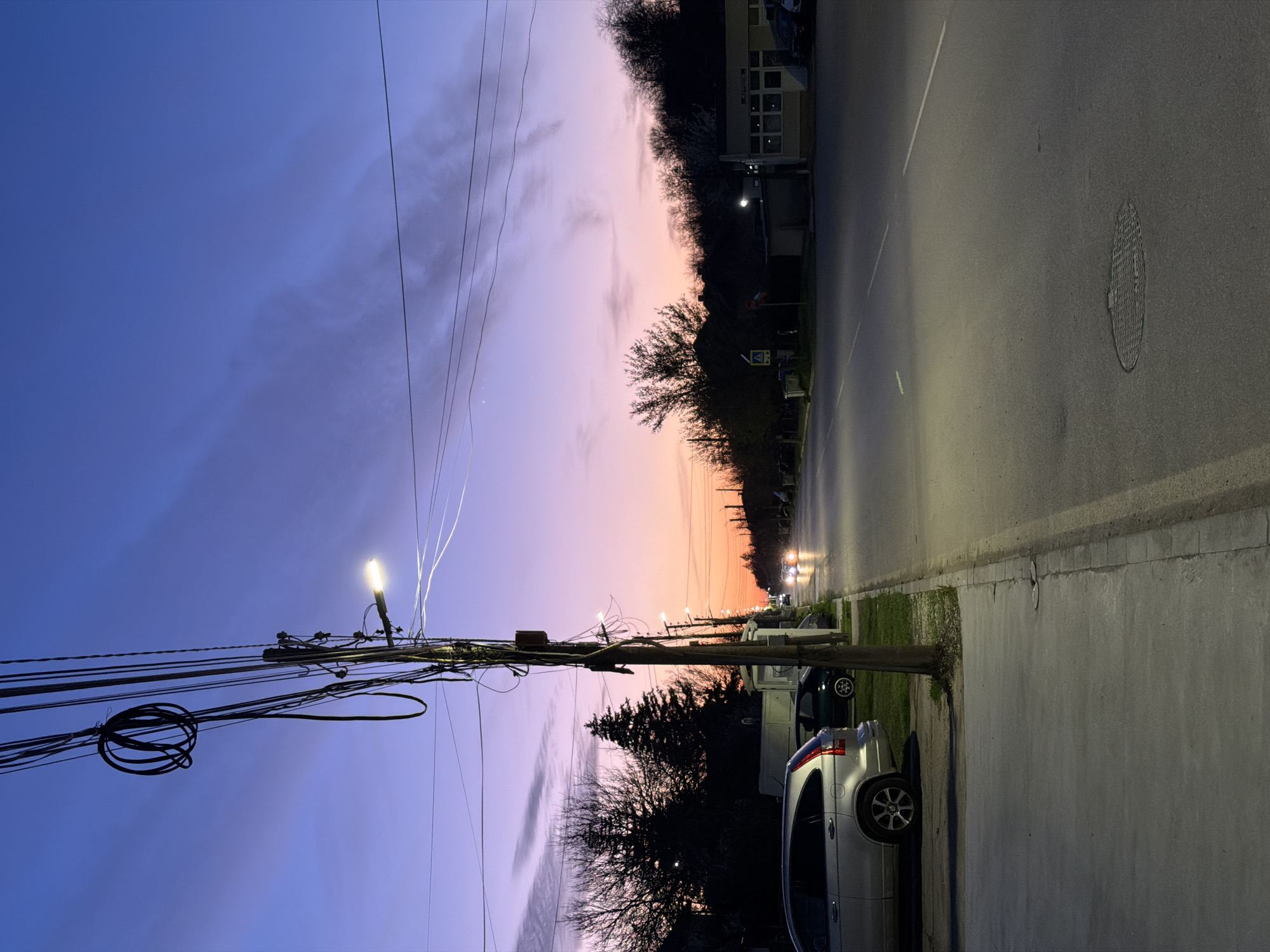 An eye-level perspective image rotated 90 degrees depicts a street scene at dusk in what is presumed to be Kozloduy, Bulgaria. The sky transitions from blue on the left to orange on the right. A power pole, laden with wires, is situated on the left side of the frame. A street runs along the right side of the frame, with parked cars lining the curb. Trees line the street in the distance and building is partially visible. Streetlights illuminate the road. Other cars can be seen along the street.