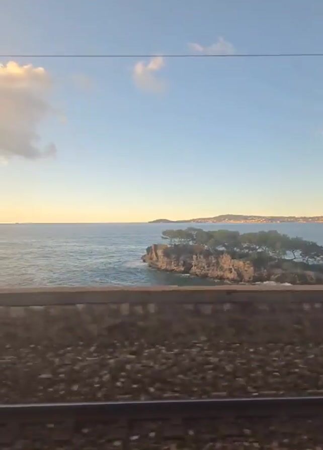 - "The camera captures a side view from a moving train, revealing train tracks and a stone wall running parallel to the sea" by FM-0E3qg2, licensed under CC BY 4.0
