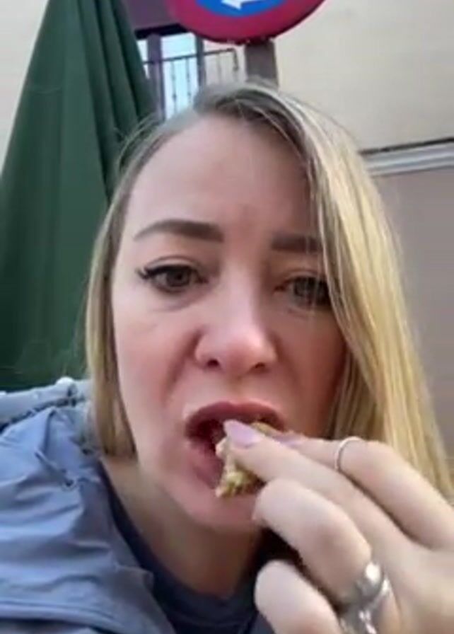 A woman with long blonde hair and wearing a grey jacket is eating a small piece of food outdoors. She looks directly at the camera as she takes a bite and chews. Behind her is a green umbrella, a building, and a no parking sign with an arrow. She appears to be evaluating the taste of the food.