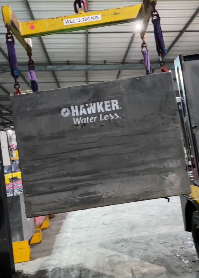 A large, gray, rectangular object bearing the text "HAWKER Water Less" is suspended from a yellow lifting beam by four purple straps