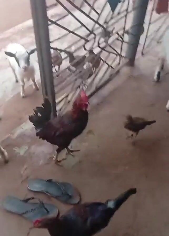 two white goats, two dark roosters, and several dark chickens on a reddish-brown dirt floor, next to a barred fence. There is a pair of sandals on the ground. The video moves around to show the goats and chickens from different angles. Laundry hangs from the fence in the background.