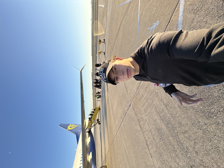 The image depicts an airport tarmac scene in Schwechat, Austria, likely at Vienna International Airport (VIE), under a clear, bright blue sky with a visible crescent moon in the upper left. A young adult male, appearing to be in his late teens or early twenties, with light brown hair and wearing a black "Coach 1941" baseball cap and a dark long-sleeve quarter-zip shirt, occupies the foreground, extending his right arm to capture a selfie. He holds a clear plastic water bottle with a red cap in his left hand. In the midground, a Ryanair Boeing 737 aircraft is parked on the concrete tarmac. Its blue and yellow tail, featuring the Ryanair logo, and the left wing with an upward-curving winglet are prominent. The rear passenger door is open, and a yellow mobile stair unit is deployed, with approximately 10-15 individuals, presumably passengers, actively moving on the stairs, either boarding or disembarking the aircraft. Several other passengers and ground staff are visible on the tarmac near the plane, some with luggage. Long shadows are cast across the tarmac from the aircraft and individuals, indicating a low sun angle from the right side of the frame. Yellow ground service equipment and orange cones are positioned further down the tarmac to the right. The background shows a flat horizon line, suggesting an open field or distant airport infrastructure.