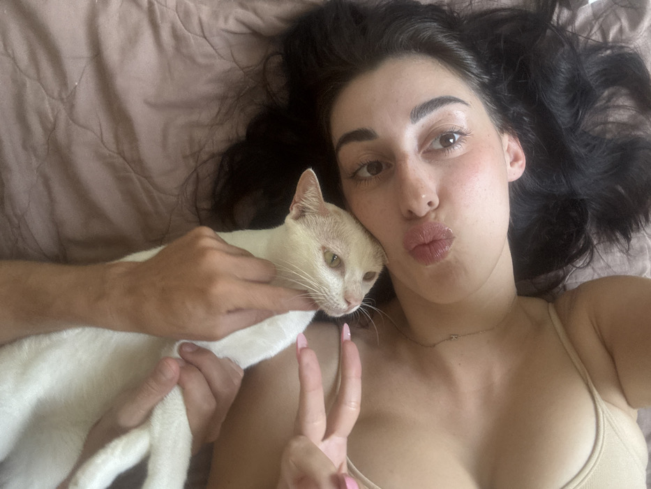 An overhead view captures a female subject lying on a light brown quilted surface, likely a bed. Her dark hair is spread around her head. She has dark eyes, defined eyebrows, and her lips are pursed in a pouting expression, looking directly at the camera. Her left hand, with light pink nail polish, is visible near her chest, forming a peace sign. She wears a light-colored, possibly beige, strap top and a delicate necklace. Adjacent to her face is a white cat with light-colored eyes. A male forearm and hand are visible holding or stroking the cat's body. The exact location in the city of Cam Đức, Vietnam, cannot be ascertained from the visual evidence provided.