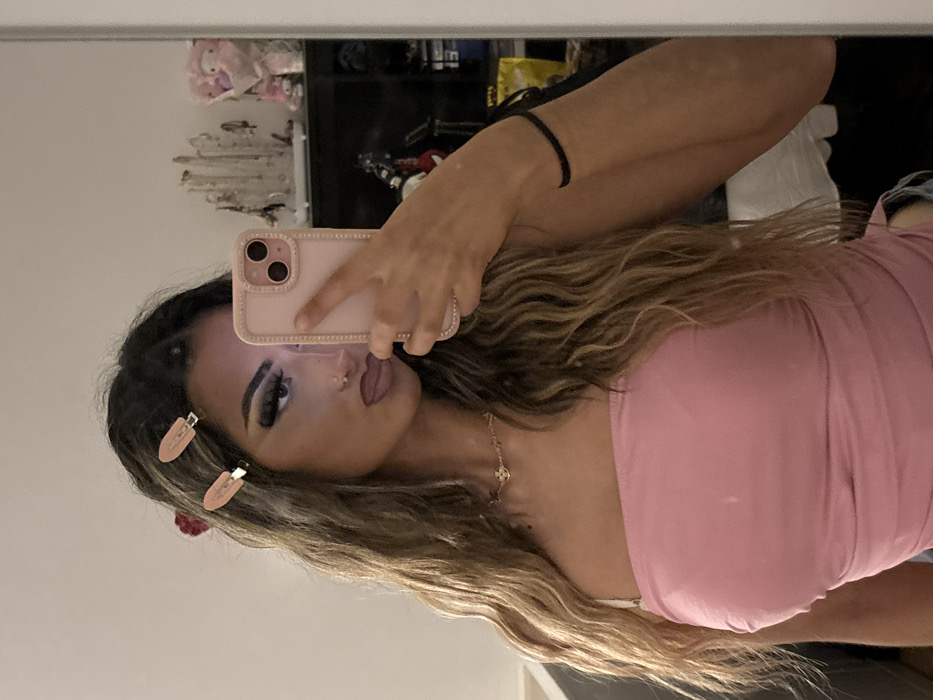 A person is taking a selfie in a mirror. They are wearing a light pink top and have long, wavy blonde hair. Two peach-colored hair clips are visible in their hair. The person is holding a light pink phone up to their face, partially obscuring it. They have a nose piercing and defined makeup. A gold necklace is visible around their neck. The background shows a shelf with various items, including a stuffed animal and other decorative objects.