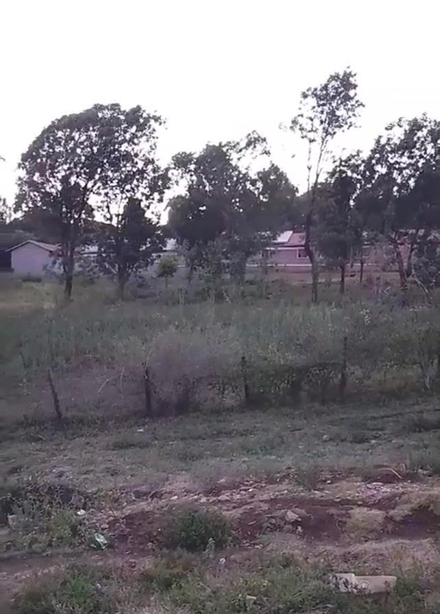 rural or semi-rural landscape at dusk or dawn. The foreground consists of overgrown grass and weeds, mixed with patches of bare, reddish-brown soil. Some scattered debris, possibly including plastic waste, is visible. A simple wire fence is partly visible, running horizontally through the middle ground. Behind the fence, the land rises slightly, with sparse bushes and trees dotting the landscape. In the distance, several buildings can be seen, likely houses, partially obscured by the trees. The sky is a pale, overcast white. There are no people or animals visible in the video. The scene is still, with no discernible motion or activity other than natural landscape.