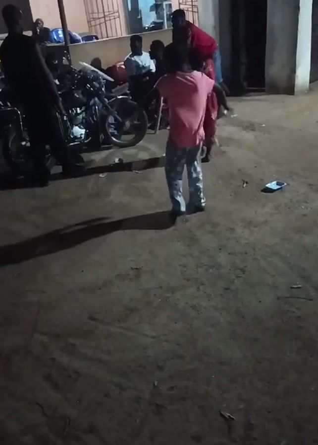 group of people standing and sitting in what appears to be an outdoor courtyard at night. Two motorcycles are parked near the group, one behind the other. A few adults are standing around the motorcycles, and several children are playing in the open space. The ground appears to be dirt. There are some discarded items on the ground, including small pieces of paper or wrappers. Behind the group, there is a building with a window, and another area with an open door. The lighting is dim, and the details are somewhat difficult to make out.