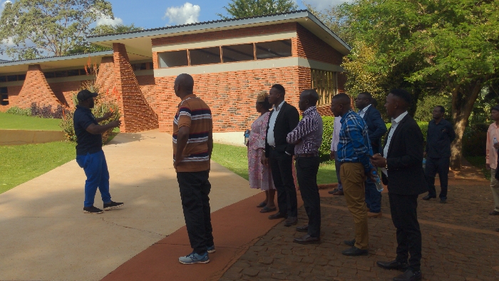 A group of approximately ten people stand outdoors on a brick walkway near a brick building. One man in a dark blue shirt and blue pants appears to be speaking and gesturing towards the building. The others, mostly men, are facing him, dressed in a mix of casual and formal attire. Trees are visible in the background, suggesting a park-like or campus setting. The overall impression is a tour or presentation of the building.